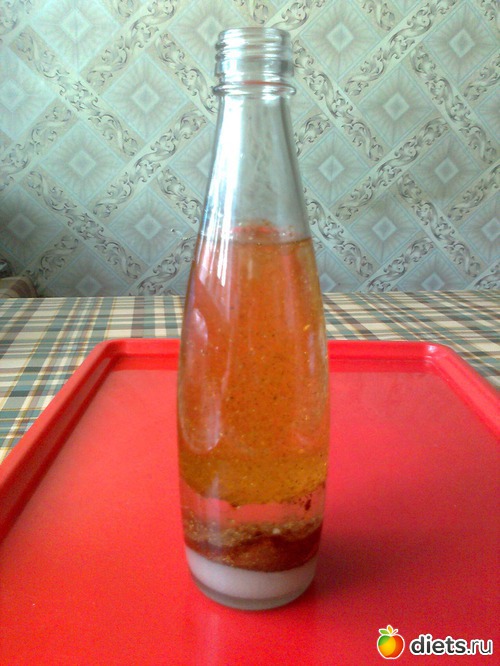Бутылочку закупорить и хорошо потрясти, чтобы растворились соль и сахар. А также чтобы весь раствор стал однородным. Так делать (перемешивать) надо перед каждой заправкой салата, так как содержимое бутылки расслаивается. Хранить заправку в холодильнике.