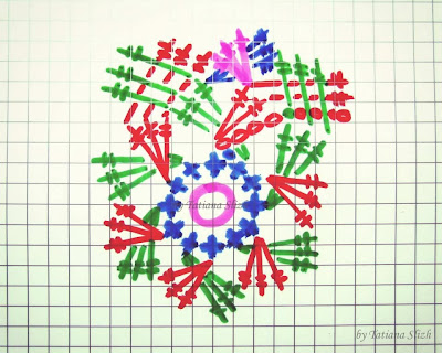 повторяем от *, заменяя 4 ВП подъема на 1 СС2Н = 12 раппортов.Схема (прибавка розово-синяя):