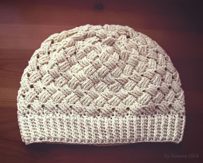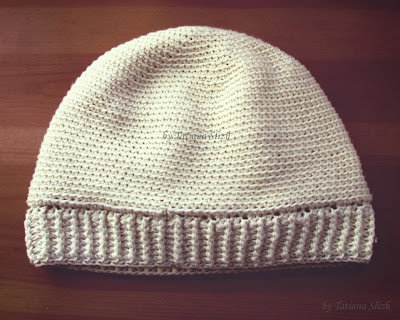 На этом этапе высота шапочки около 15 см. По краю - 96 петель.4. Резинка.1 ряд: 2 ВП подъема, 95 ПССН (полустолбиков с накидом) за переднюю полупетлю пред. ряда (!), завершаем ряд СС.2-8 ряды: 2 ВП подъема, далее чередуем лицевой и изнаночный рельефные ПССН, завершаем ряд СС.Нить обрезаем, прячем хвостик.Шапочка уже приобрела узнаваемый вид (высота около 19 см):