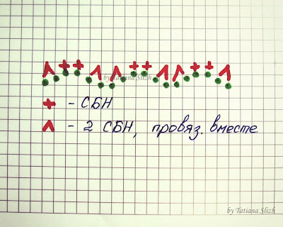 2 ряд: *4 ВП подъема, 2 СС2Н в 1-ый СБН пред. ряда, 3 СС2Н в послед. СБН пред. ряда (ВАЖНО! крючок в СБН вводим за уже провязанными ВП подъема и 2-мя СС2Н), пропускаем 1 СБН пред. ряда, повтяряем от *, заменяя ВП подъема на 1 СС2Н.