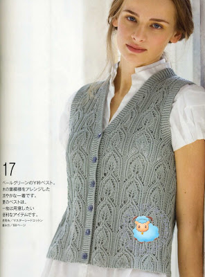 Размер: 40 Вам потребуется: 300 г пряжи 50% акрила, 50% вискозы темно-синего цвета (№ 567); спицы № 4. Узоры: резинка 1/1, резинка 2/2, лицевая гладь. Плотность вязания: 24 п. х 31 р. = 10 х 10 см (лицевая гладь). Описание работы Спинка. Набрать на спицы 96 п. и связать 8 см резинкой 1/1 (на фото по низу жилета резинка 2/2 – прим. пер.). Продолжить вязание лицевой гладью. На общей высоте 33 см сформировать реглан: убавить с обеих сторон в каждом 2-м ряду 10 раз 1 п. На общей высоте 39 см закончить вязание. Далее набрать на спицы 40 п. (пройма), набрать 76 п. по краю горловины и набрать на спицы еще 40 п. (пройма). Связать 10 см резинкой 1/1 и оставить петли на вспом. спице. Перед. Вязать, как спинку, до общей высоты 33 см. Для выреза горловины закрыть центральные 8 п. и закончить обе стороны раздельно, закрывая со стороны горловины в каждом 2-м ряду 6 раз 6 п. (судя по выкройке, после закрытия центральных петель нужно связать без убавлений 3 см и только потом начать убавлять петли со стороны горловины – прим. пер.). Одновременно сформировать реглан, как на спинке. На общей высоте 39 см закончить вязание. По краю горловины обеих половинок переда набрать 34 п. и еще 40 п. (пройма). Связать 10 см резинкой 1/1 и оставить петли на вспом. спице. Кокетка. Соединить на одной спице 156 п. спинки и по 74 п. обеих половинок переда. Связать 1 ряд следующим образом: * 1 лиц., 2 п. вместе лиц. *, повторять от* до * до конца ряда. Связать на оставшихся петлях 7 см резинкой 1/1. Далее связать 1 ряд следующим образом: * 1 лиц., 2 п. вместе лиц. *, повторять от * до * до конца ряда. Связать на оставшихся петлях 3 см резинкой 2/2. Закрыть петли по рисунку. Сборка. Выполнить плечевые и боковые швы. Для планки горловины переда набрать справа по краю выреза 60 п. и связать 1 см лицевой гладью. Затем связать 1 ряд следующим образом: * 1 накид, 2 п. вместе *; повторять от * до * до конца ряда. Продолжить вязание резинкой 2/2. На общей высоте 3 см закрыть петли по рисунку. Левую планку вязать аналогично. Наложить правую планку на левую и пришить внизу выреза горловины потайными стежками. Перевод Aneta с форума hobbyportal.ru.