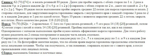ПЕРЕД: выполнить ту же работу, что и для спинки, но через 40/42/44 см от нижнего ряда выполнить горловину, убавив центр. п., продолжать каждую сторону отдельно. Останется 26 п. для каждого плеча и через 50/52/54 см от нижнего ряда закрыть все п. одновременно.[cut]