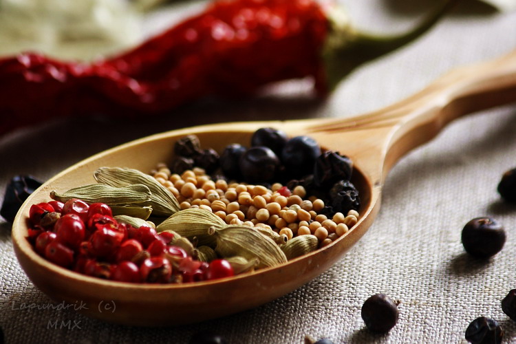 У меня в ложке там розовый перец, кардамон, белая горчица, чёрный перец горошком и на нём несколько ягод можжевельника. :)