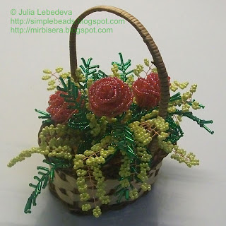 Дальше из гипса, ПВА и воды делаем густую смесь и сажаем туда цветочки. Горшочек мне не очень нравился, поэтому я его немножко украсила. И вот, такой букет роз из бисера у меня получился.