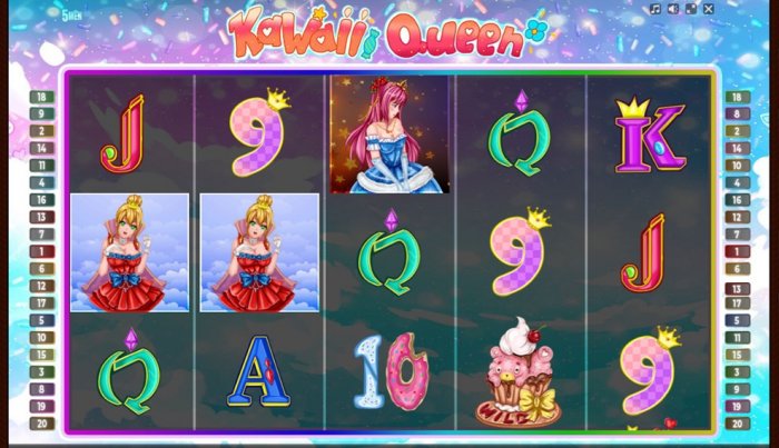 - Игровое поле слота "Kawaii Queen" представляет собой 5 барабанов с 3 рядами ячеек, и на нем активно функционирует 20 фиксированных линий выплат.